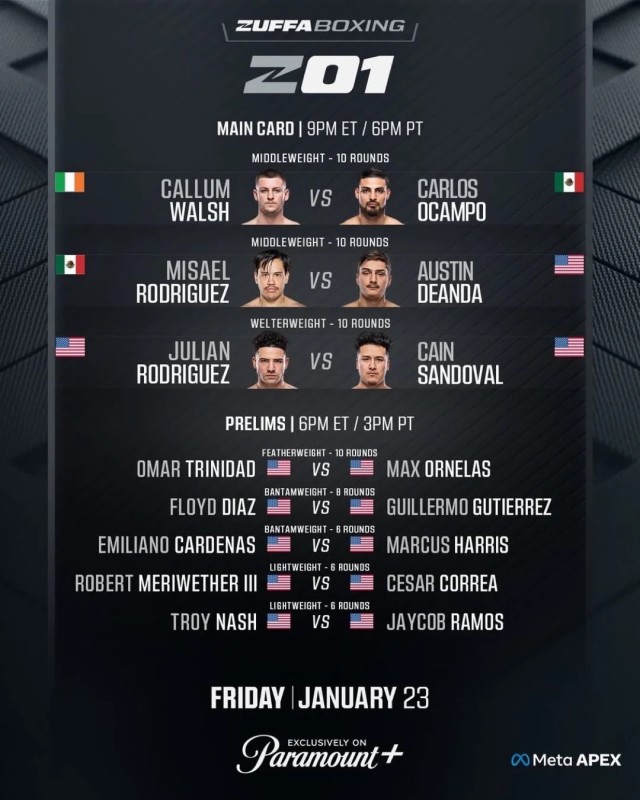 The Walsh–Ocampo bout headlines the main card and serves as the official launch point for Zuffa Boxing’s partnership with Paramount+.