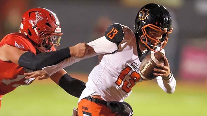 In his junior season at Cocoa High School, Champ Smith completed 206 of 349 passes for 2,350 yards, tossing 14 touchdowns against 13 interceptions across 12 games. On the ground, he added 193 rushing yards and one touchdown while scrambling, contributing to the Tigers’ strong playoff push despite the balanced but turnover-prone passing numbers.