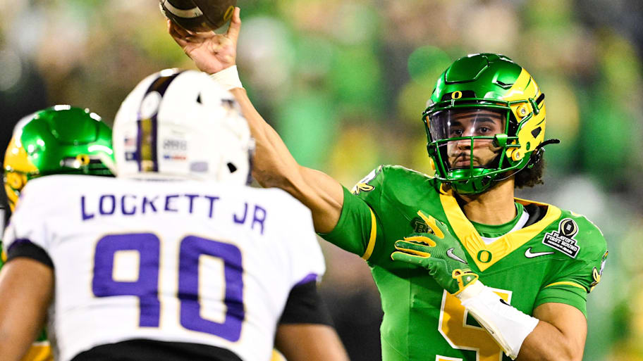 "It was on display the minute that ball got kicked up in the air and Oregon got the football," TNT commentator Victor Cruz said after the game about Moore's talent. "We understood that he was the No. 1 quarterback in this draft class and he proved it coming out and going five for five, just really throwing the ball downfield right here to Kenyon Sadiq, their highly-touted tight end and gets in the endzone with a one-handed catch. And then tucking the ball. You want a player comp TK? I'm going Trey Lance."