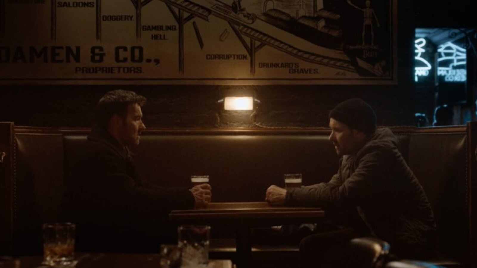 Back at home, Dark Matter Episode 8 continues with Jason 2 in the garage covering the body of the Jason he just killed. Charlie walks in, tells him the pizza is here, and asks if he wants any help, but Jason says no and to go back inside. In the city, Jason 1 continues walking with the other Jason tailing him. Jason 1 walks into Village Tap, gets a drink from Matt (William Smillie), and looks in the corner to see another Jason sitting in a booth drinking.