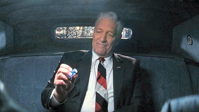 Vault-Tex executive Hank MacLean was always working for The Enclave. He had a secret Enclave Pip-Boy with him in his vault, the one his first wife Stephanie used to call for the group’s help. He had also been working in the Vegas vault to perfect miniaturization of the mind control device Vault-Tec had acquired from Mr. House centuries earlier. Hank succeeded. Not only did he turn wastelanders into pleasant, compliant slaves (via poor Diane Welch’s brain), in the Fallout season two he told Lucy his new R&D was already out in the world. He’d implanted people and sent them off to fulfill orders given centuries ago by the Enclave.