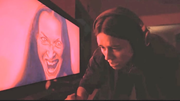 Evy is also a podcaster (join the club!), co-hosting the paranormal exploration show The Undertone. Evy is the unerring skeptic, while her partner, Justin (Adam DiMarco), believes so much that he’s put Agent Mulder to shame. Justin has recently received a mysterious email with 10 audio recordings on it and—because this is a movie—he and Evy decide to listen to them for the first time on-air. The recordings detail a series of strange occurrences befalling a couple, Jessa and Mike, with the former talking in her sleep. These recordings—conveniently spread across three podcast taping sessions—begin to paint a picture of some sort of demonic entity. Naturally, this all has something to do with Evy and her mom, because it’s a modern horror movie.