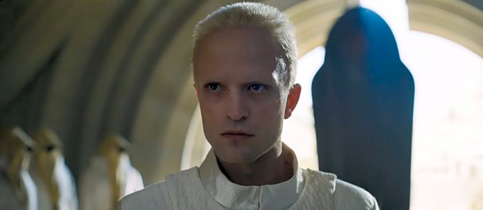 But in front of Edric, we also get our first look at Robert Pattinson, as Scytale the Tleilaxu Face Dancer! The Tleilaxu are a new antagonist we meet in Dune Messiah. They are a secretive race of humans who specialize in bioengineering and are reviled by the rest of the Imperium due to their unethical practices.