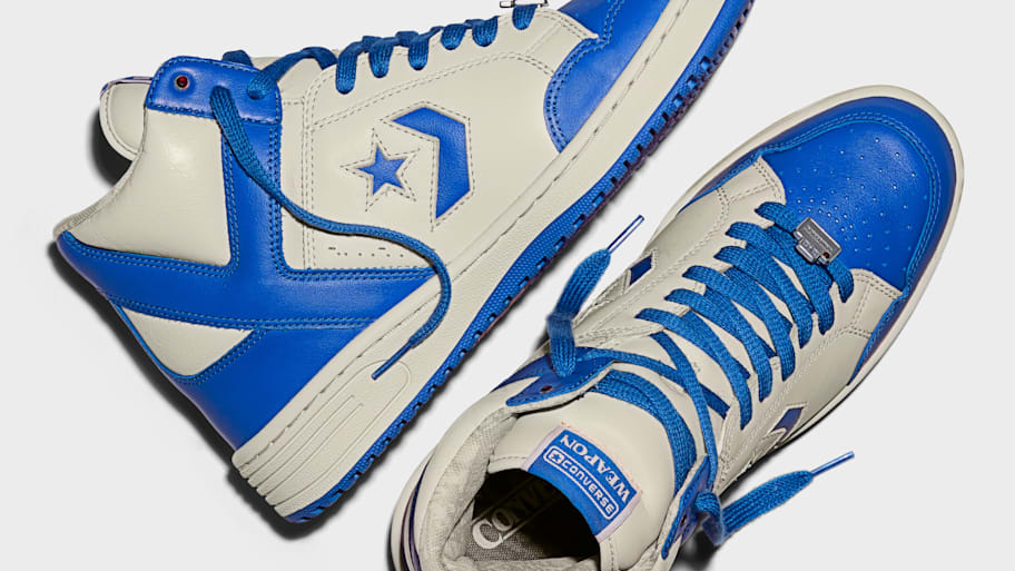 The Converse Weapon features a bold new colorway inspired by the original 1984 Weapon catalog, as well as premium leather uppers with distressed underlays that recall the era's vintage aesthetic.