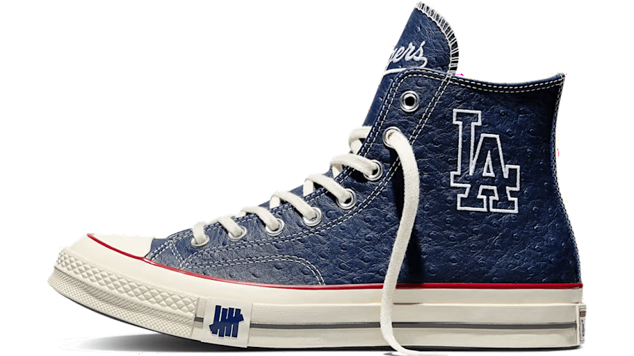 Converse and L.A.-based brand UNDEFEATED teamed up to honor the Los Angeles Dodgers. This version of the Chuck 70 features unique materials like a "Dodger Blue" faux ostrich leather upper with printed and embroidered co-branding throughout the silhouette.