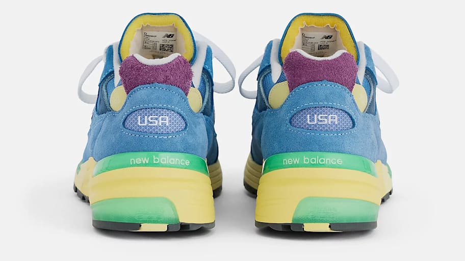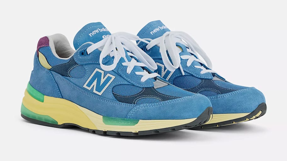 The iconic New Balance 992 returns in a new, seasonal colorway with cooler tones for spring and summer. It features a mesh, suede, and synthetic construction in a deep sea stone hue, with green apple and maize accents.