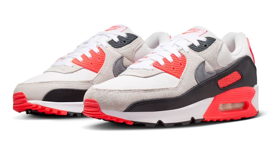 The Nike Air Max 90 "Infrared" colorway drops at 10:00 a.m. EST on Thursday, March 26. Online shoppers can buy the casual sneakers for $150 in adult sizes on the Nike SNKRS app and at select retailers.