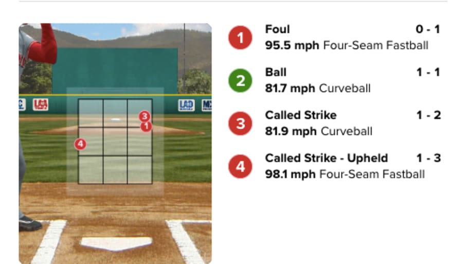 He struck out a pair in his first inning of work, placing a 98.1 mile per hour heater on the inside edge for a called third strike that was upheld after review. If he's able to spot his pitches like this with that kind of velocity, he's going to be banging on the door to the big leagues shortly. That fourth pitch is just nasty.