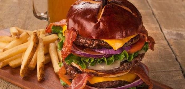 Cubs fans have more than great pitching at Wrigley Field, 'Da Burger' takes a pork patty and piles it high with sliced ham, bacon, Swiss cheese, pickles and a spicy mustard aioli.