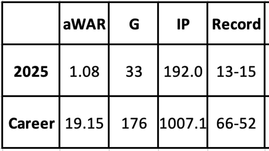 He finished the season with his worst career strikeout rate (21.5%), though his walk rate improved marginally from 2024 (8.1% vs 8.7%). He remained healthy for the duration, making 33 starts and completing a workhorse 192-inning load.