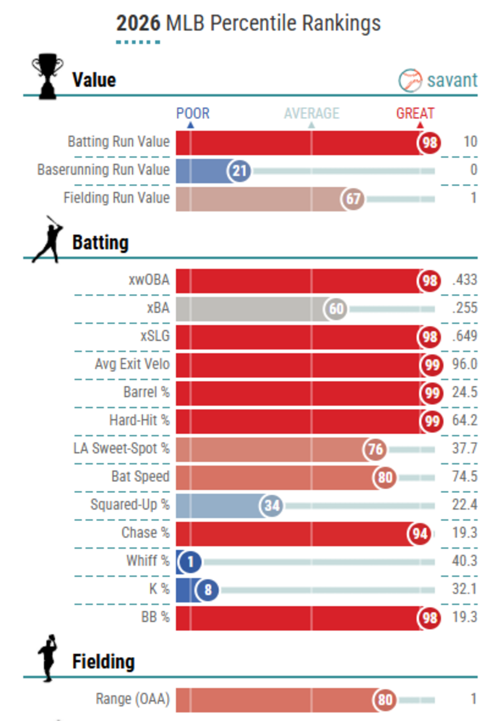 The guy is hitting the ball harder than almost anyone in the world. But then you see the blue. A 40.3% whiff rate (1st percentile.) A 32.1% strikeout rate (8th percentile).