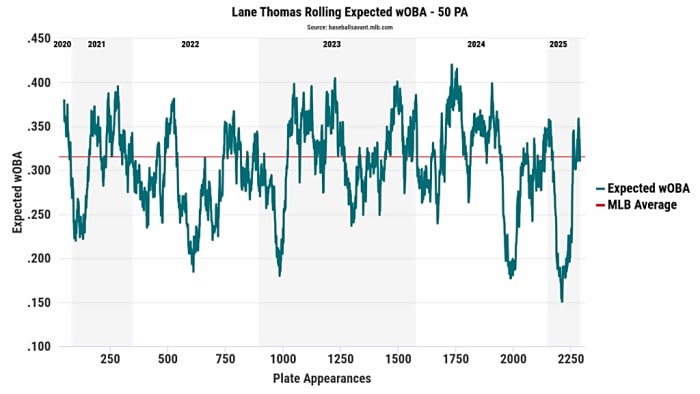 In 329 plate appearances with the Guardians, Thomas slashed .189/.258/.340 with a .598 OPS. When looking at his xwOBA rolling chart, he saw a sharp drop in xwOBA after the trade deadline in 2024, and it never bounced back in 2025 (though the latter was likely due to injuries).