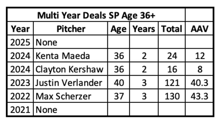 Three future Hall of Famers in Clayton Kershaw, Justin Verlander, and Max Scherzer, along with Kenta Maeda, simply do not make a viable comp list. The Maeda contract made little sense, as he pitched poorly in 2021 and 2023, and missed all of 2022 with injury.