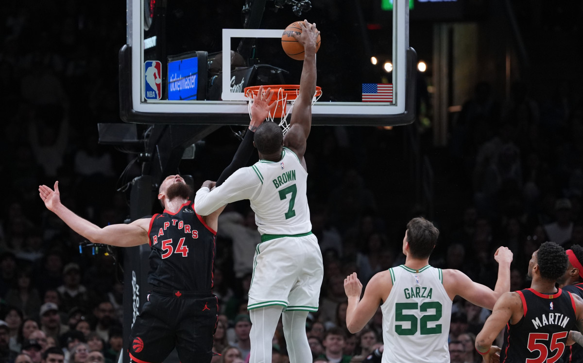 With 5:35 remaining in the fourth quarter, Brown caught a pass from Pritchard at the top of the arc and immediately drove to the basket, getting past Raptors guard Alijah Martin. He then met Sandro Mamukelashvili at the rim and finished with a posterizing dunk over the Toronto forward.