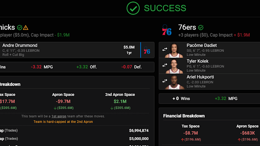 For the 76ers, they are getting a younger backup center for Embiid in Hukporti, a versatile project wing in Dadiet and a scrappy young floor general to fit the young backcourt depth in Kolek. The trade would also put the Knicks in the first apron, rather than the second apron in which they are in right now.