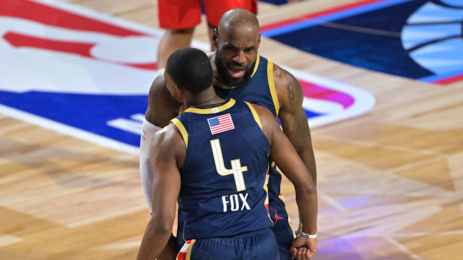 The Stripes were made up of some of the more veteran Americans, and Fox's jumper put the old heads past the youngsters 42-40 in the second 12-minute contest of the day. After hitting the winner, Fox shared a moment with LeBron James.