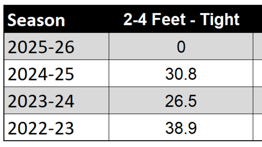 A second peripheral stat is Murray's mid-range shooting is his shooting splits by the closest defender. He's relied heavily on getting wide-open looks throughout his career, which isn't necessarily a bad thing, but he hasn't shown the ability to hit shots at a high clip when defenders are closer.