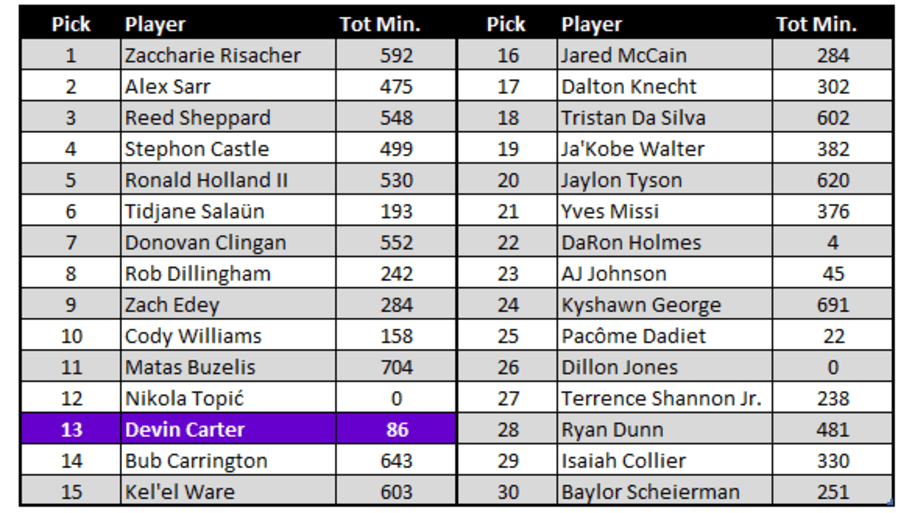 Outside of injured Nikola Topić, you have to drop to the 22nd pick DaRon Holmes to find another sophomore player who has played less than Carter. And it's not even close, as most players are deep in the hundreds of minutes this year.