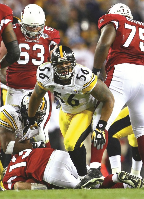 Warner dropped back, scrambled and was about to heave a pass to the end zone — where the great Larry Fitzgerald was lurking — when Woodley swatted Warner’s forearm, forcing a fumble that defensive end Brett Keisel recovered with five seconds left to seal a 27-23 Steelers win.