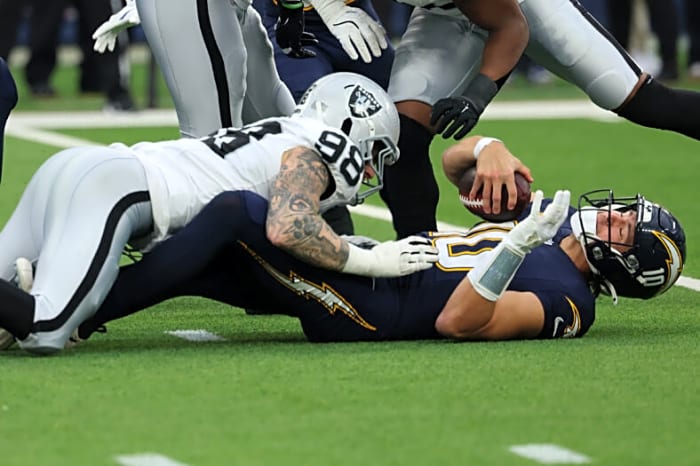 Herbert suffered the break on a scramble when Raiders safety Jeremy Chinn’s helmet collided directly with his non-throwing hand. Despite visible discomfort, Herbert stayed in the game long enough to throw a touchdown on the very next play, then briefly retreated to the locker room to have the hand stabilized with a cast and glove.