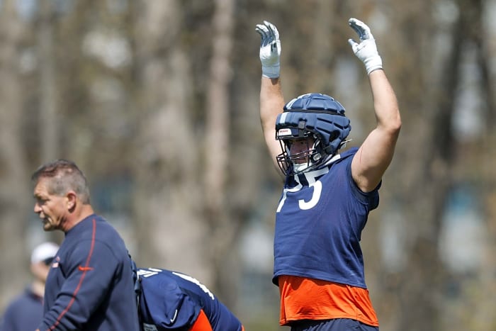 The Chicago Bears took the field on Wednesday for the start of their second week of voluntary OTA practices. One of the biggest questions regarding the team is the plan for the left tackle position. Braxton Jones is still recovering from a broken ankle and has yet to take the field. Jones is not expected to return until potentially training camp in July, leaving the Bears with two options: Kiran Amegadjie and Ozzy Trapilo.