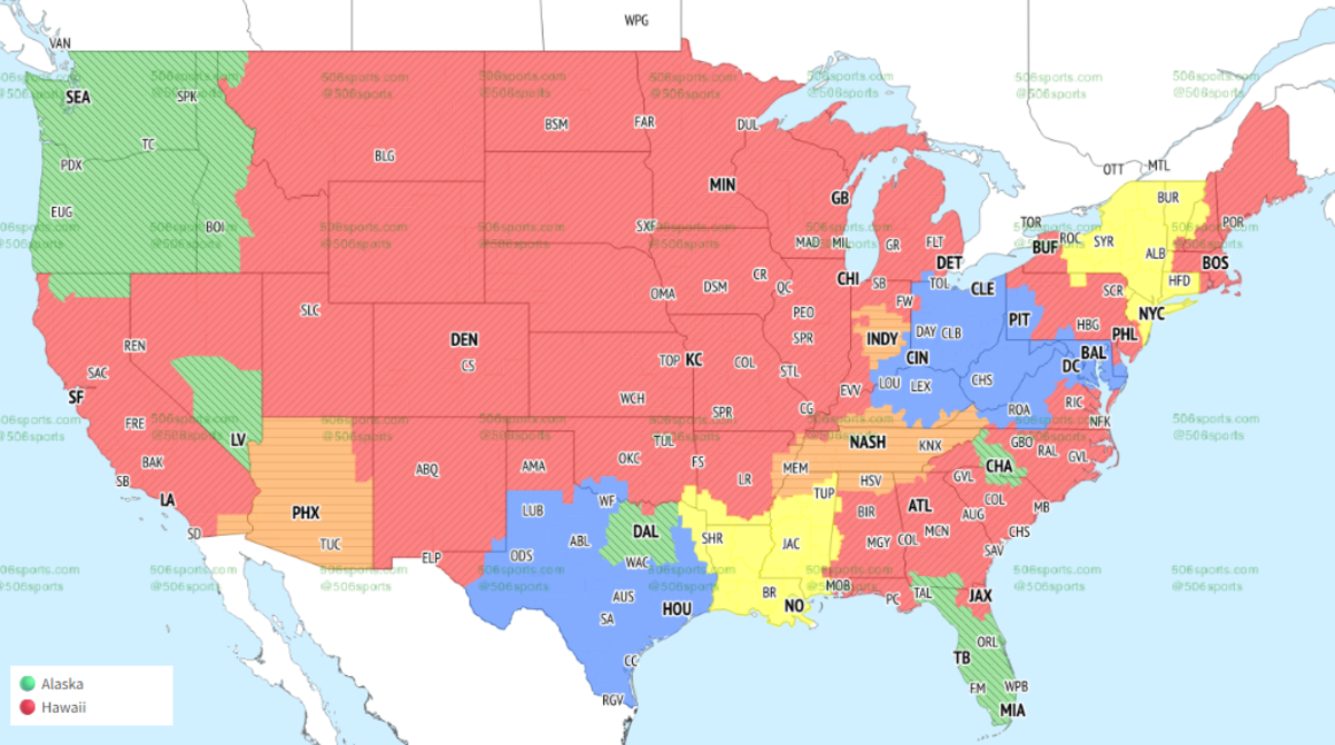 The Broncos were on primetime television for the 'Monday Night Football' game against the Bengals, but that won't be the case for the Week 5 matchup. Site 506sports.com released a coverage map showing where across the country the Broncos' game will air (red).