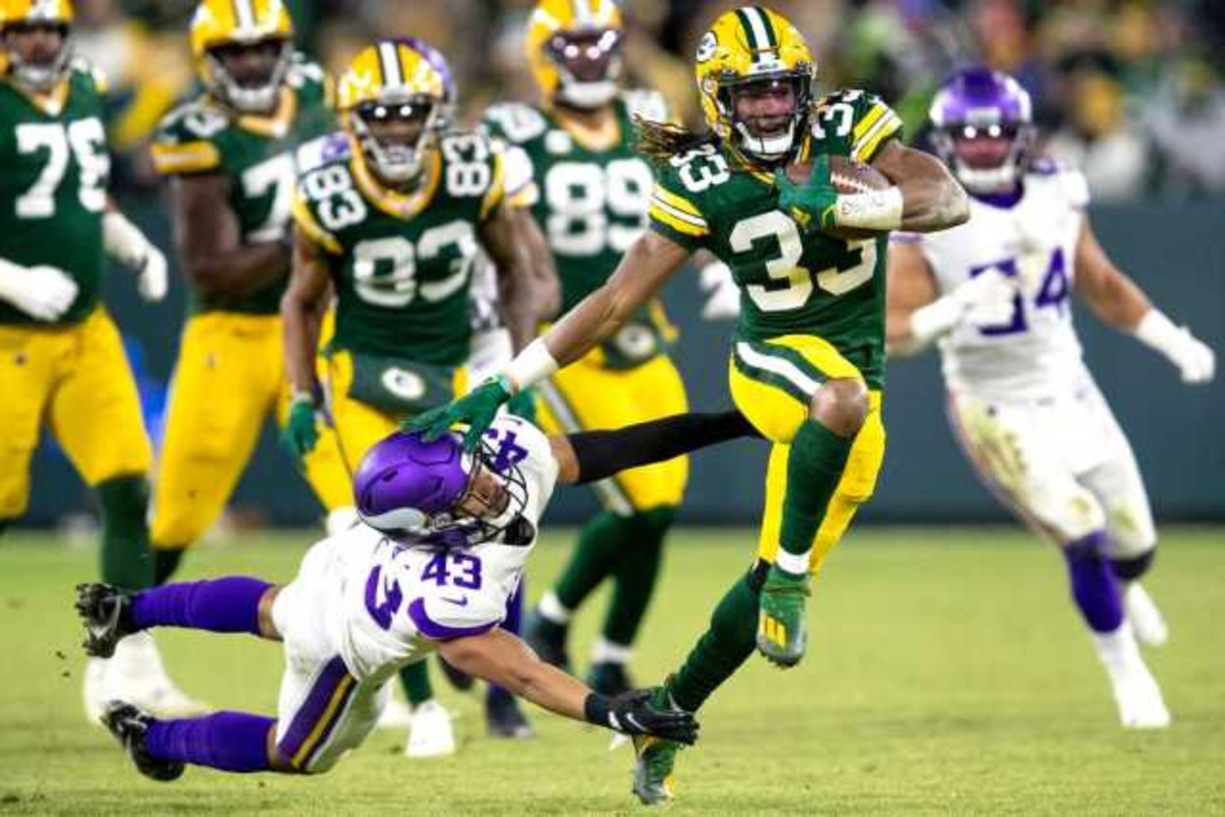 From 2017-2023, running back Aaron Jones prowled behind Green Bay’s offensive line and became one of the most productive backs in team history. During his seven years, Jones rushed for 5,940 yards, caught 272 receptions for 2,076 more yards, and scored a total of 63 touchdowns.