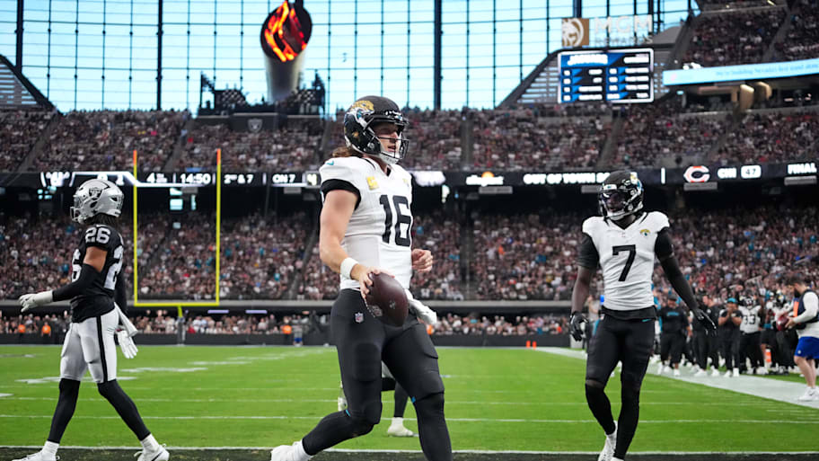 JACKSONVILLE, Fla. -- Jacksonville Jaguars quarterback Trevor Lawrence was up all Saturday night and Sunday morning sick, but it didn't matter as his two rushing scores led the way for the Jaguars in a 30-29 overtime win over the Las Vegas Raiders.