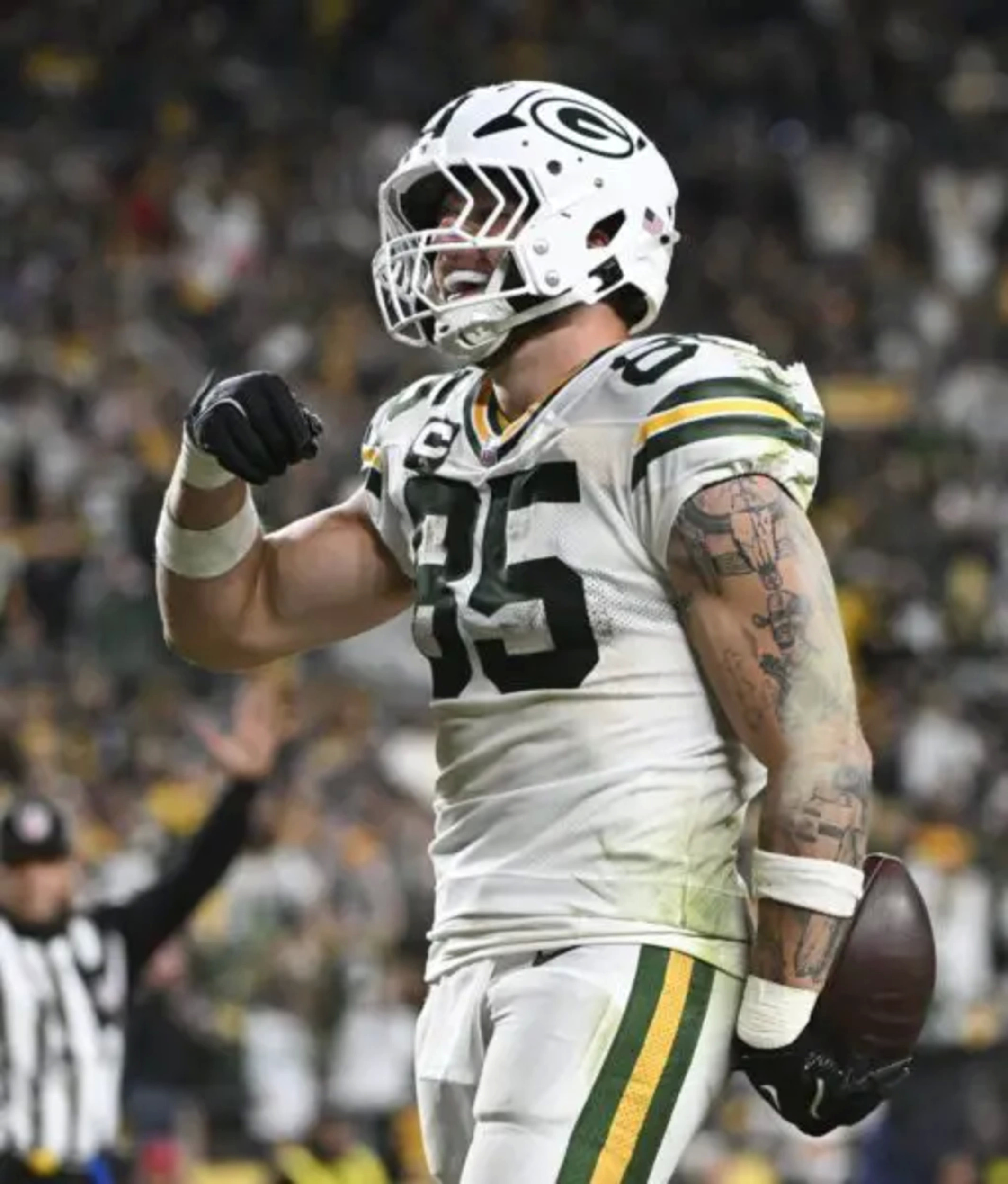 On the dropback that could have resulted in his franchise-record-setting 21st straight completion, Love ended up throwing the ball away on second down in the direction of tight end Tucker Kraft, who ended the game with 7 receptions for 143 yards and 2 touchdowns.