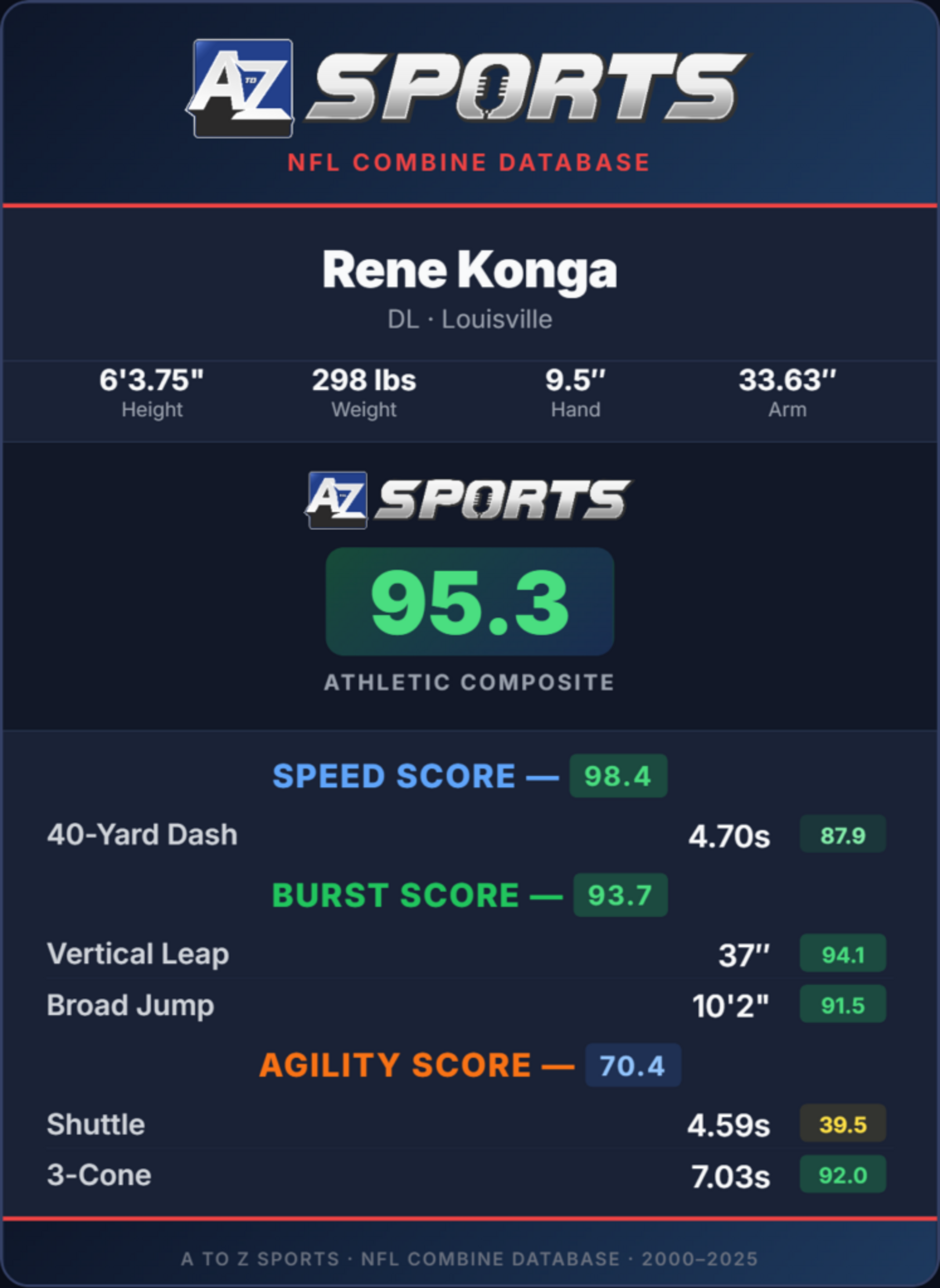 At a hair under 6-foot-4 and 298 pounds, Konga posted some eye-popping numbers at his Pro Day in late March. He recorded a vertical jump (37 inches) and a broad jump (122 inches). Those would’ve been the best marks at the 2026 NFL Scouting Combine this year. Konga’s 1.60s 10-yard split showcased a faster get-off than quite a few receivers in this draft class. His overall athletic profile is one of the best in the class, earning a 95.4 mark in the A to Z Sports Athletic Composite.