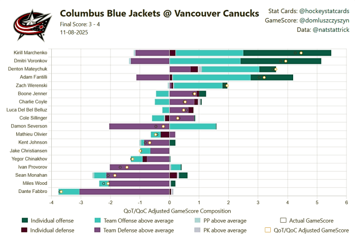 According to HockeyStatCards.com , Fabbro had a team-low adjusted game score of minus-3.71, while Monahan, Wood, and Ivan Provorov also struggled. Marchenko, Voronkov, and Denton Mateychuk all had great games, though, per the scorecard.