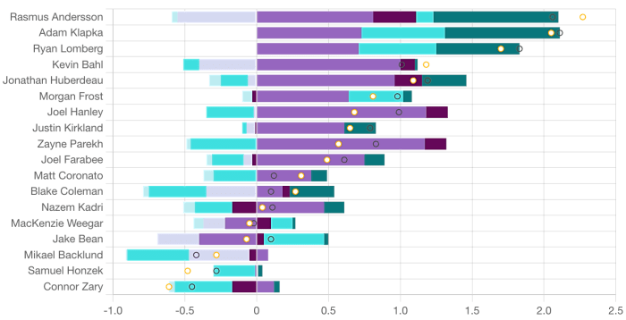 Corsi King – Jonathan Huberdeau (90.46 CF%) and Nazem Kadri (86.95 per cent) were strong most of the night. Kadri was not prepared to cover for Jake Beans (76.37 per cent) rebound and it got Scheifele the only good break they would earn all third period. I don’t really think that is his fault, rather the defender didn’t need to jump up in the play in that situation – especially if he was just going to hand possession back like that. I’m not a fan of the “any shot is a good shot” mantra, I much prefer maintaining possession and getting high danger looks from the lower slot. The fourth line probably had their best night of the early season. Adam Klapka (79.23 per cent) refused to lose possession of the puck on the boards and got it back to Andersson (70.77 per cent) whose quick shot – combined with a good screen from Ryan Lomberg (85.12 per cent) – ended up being the only goal in the game for Calgary.