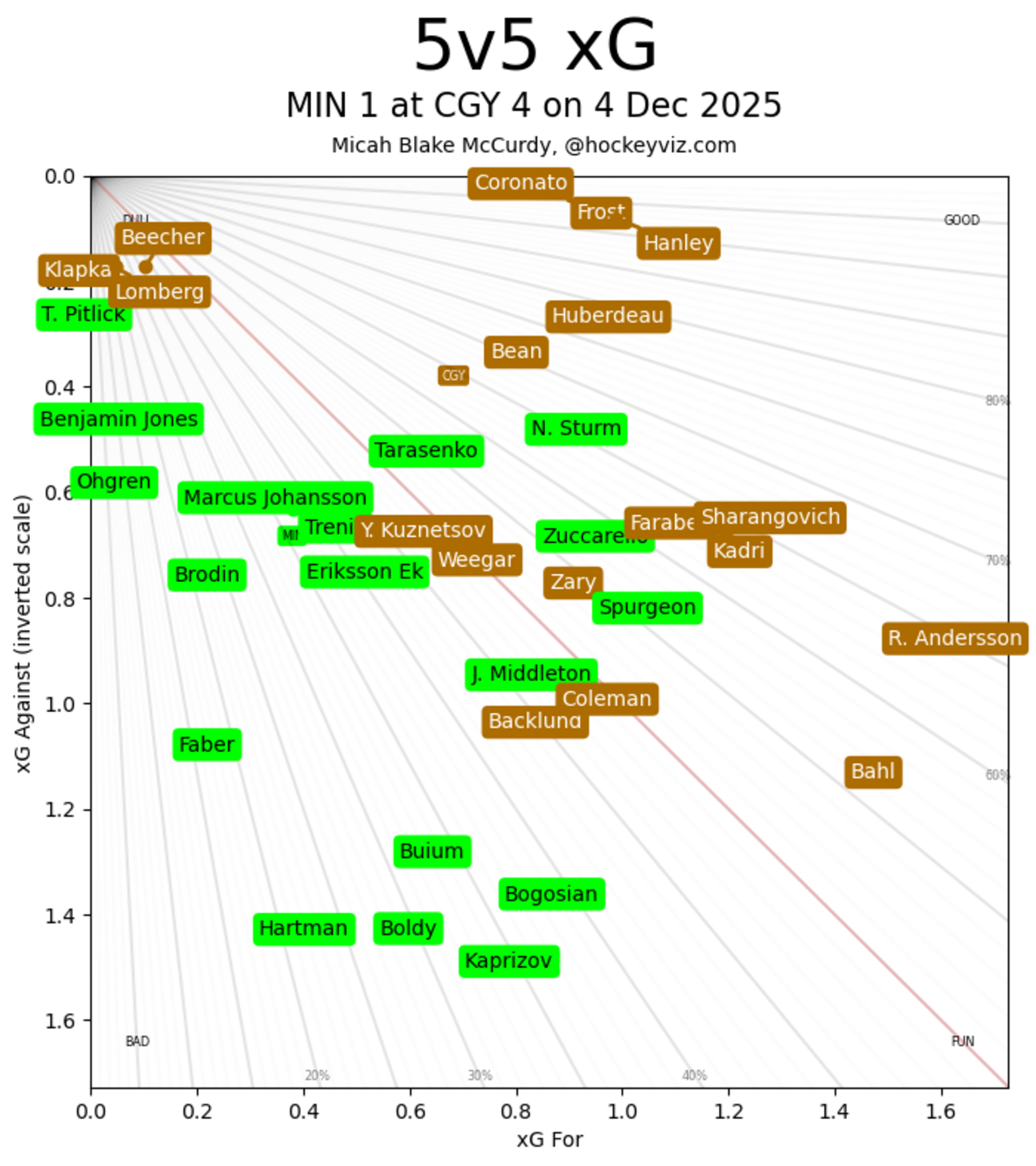 xGF% – Connor Zary (43.59 per cent) is tasked with some heavy shutdown minutes playing next to the captain. Being able to generate the chances he earned – against that level of competition – is no small feat. Zary continues to use that slump busting goal to drive himself forward and stay relevant as a consistent producer. Joel Hanley (83.25 per cent) led the way for the defence group. He played a nice simple game and didn’t try and stretch himself too thin.