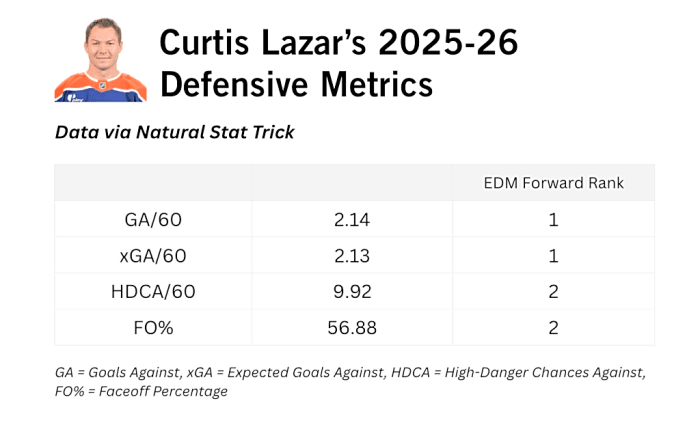 Lazar is giving the Oilers exactly what they hoped to find when they reshaped their bottom six this summer. On a roster where roles have been fluid, he earned his spot through consistent hard work and solid underlying results. When the Oilers are healthy, tough lineup decisions are coming, but Lazar should not be one of them.