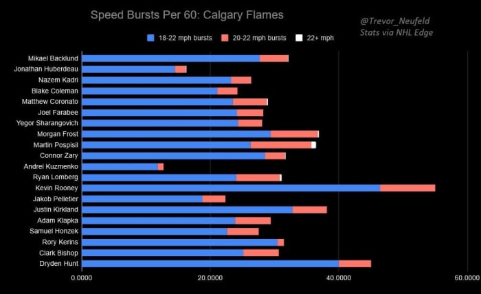 Let’s examine the Flames forwards in terms of speed bursts per 60 minutes of ice time. The list goes from most minutes played to least.
