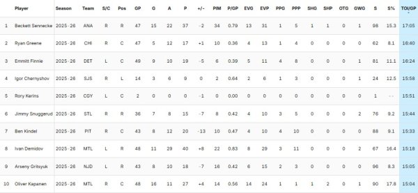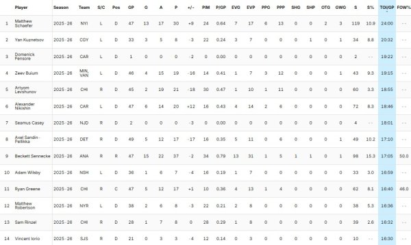 We can see that Demidov’s two closest pursuers for points, Matthew Schaefer and Beckett Sennecke, are in first and ninth place with 24:00 and 17:05 of ice time respectively.