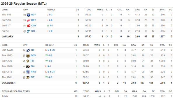 The young goaltender has won just one of his five games since the holidays. He has, however, faced some big clubs on a regular basis, in his defense.
