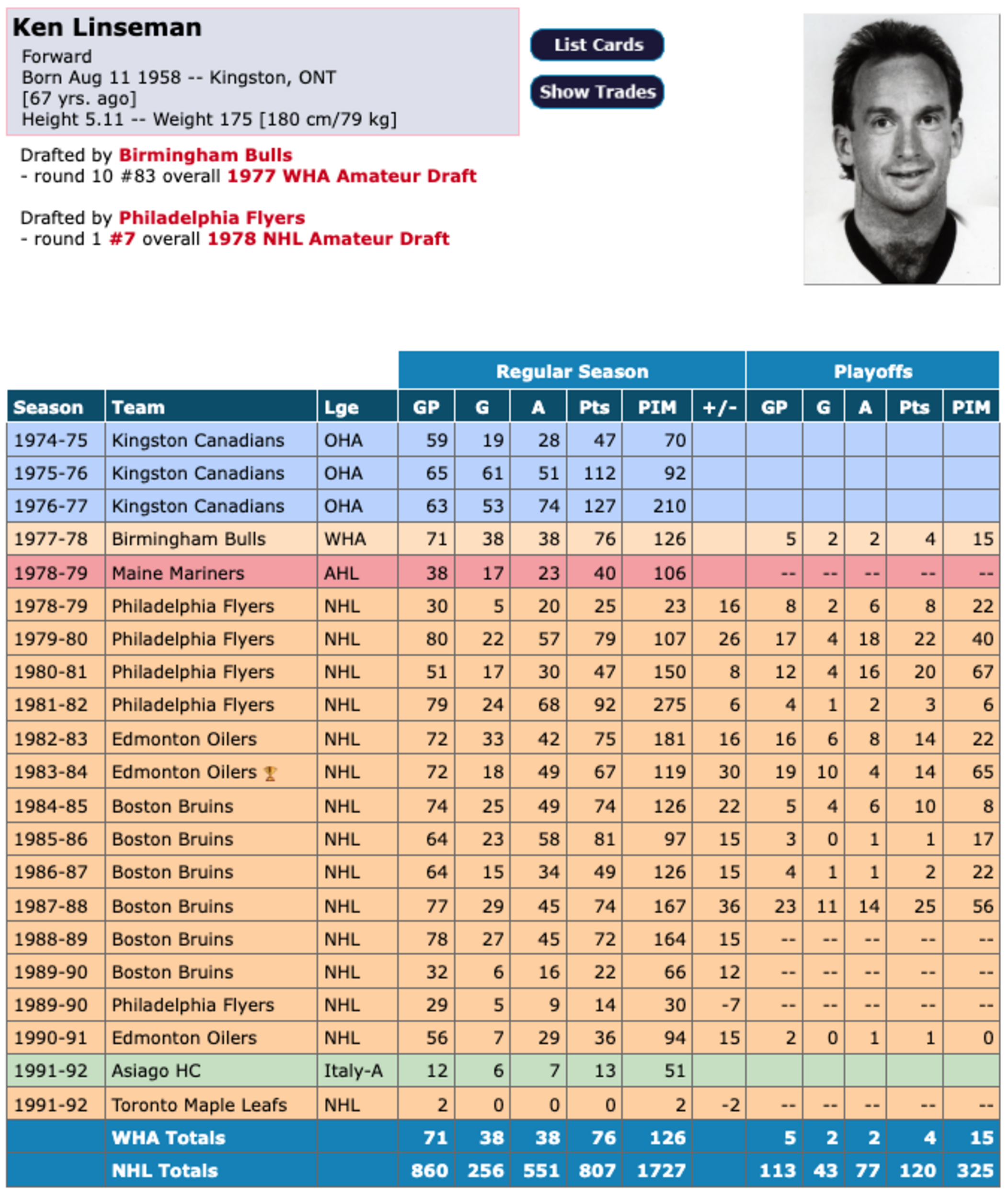 Ken Linseman was the catalyst for the NHL to lower the draft age to 18 years old. As a junior with the Kingston Canadians, he was a late selection by the Birmingham Bulls of the World Hockey Association in 1977.