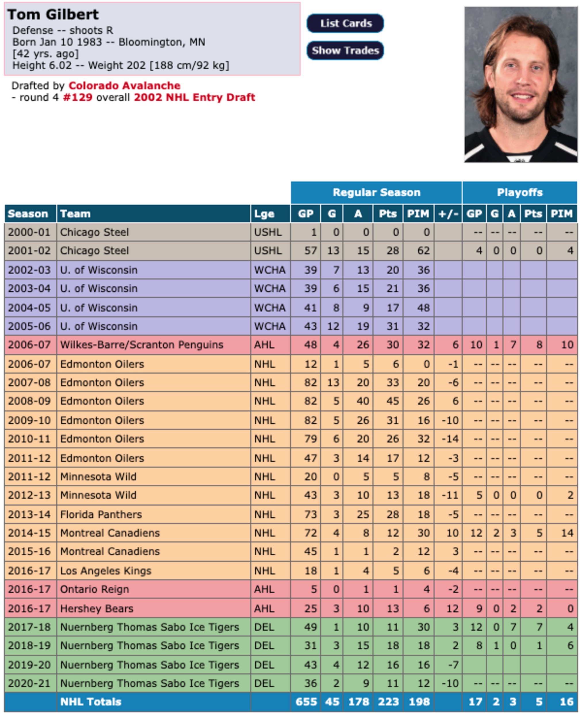 Gilbert’s rights came to Edmonton from Colorado in the 2004 Tommy Salo trade, back when he was still at Wisconsin. He spent four strong years there, developing into one of the best all-around defencemen in the program’s history. That 2006 national title and All-American nod put him on the map, and he transitioned smoothly into the NHL soon after.