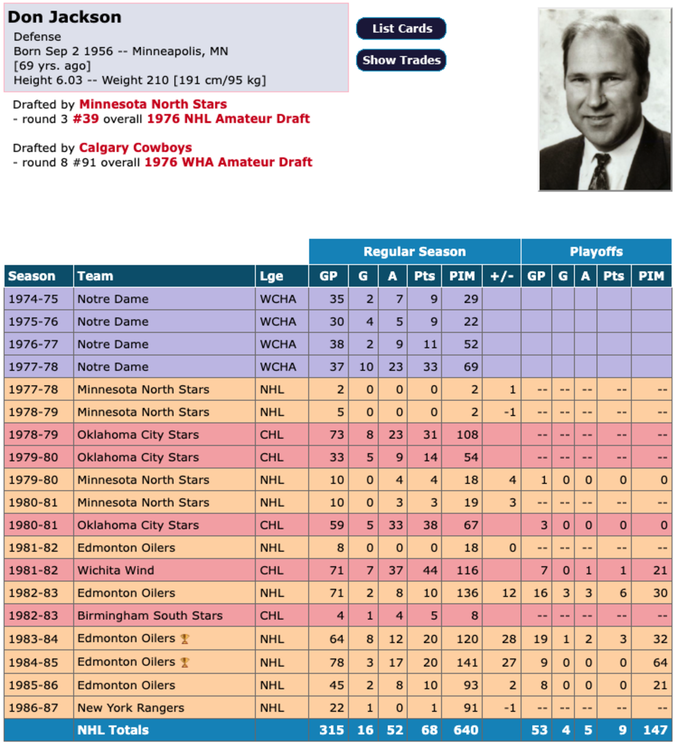 A 39th-overall pick by the Minnesota North Stars in 1976 after a standout run at the University of Minnesota, Jackson carved out a blue-collar NHL career built on reliability and edge. He played 463 games, piling up 776 penalty minutes and 38 points while doing the sort of heavy lifting that doesn’t show up on score sheets.