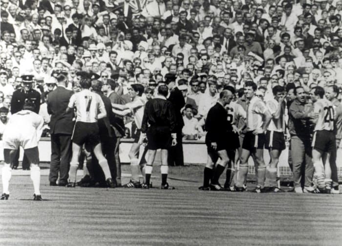 The long-standing rivalry between Argentina and England was sparked during their quarterfinal match in 1966, when vocal Argentine Antonio Rattín was tossed from the contest by referee Rudolf Kreitlein, for what the German called a "violence of tongue." Kreitlein, however, did not speak Spanish. Rattin, who felt there was a bias toward England, was so enraged that he refused to leave the pitch and needed to be escorted by police.