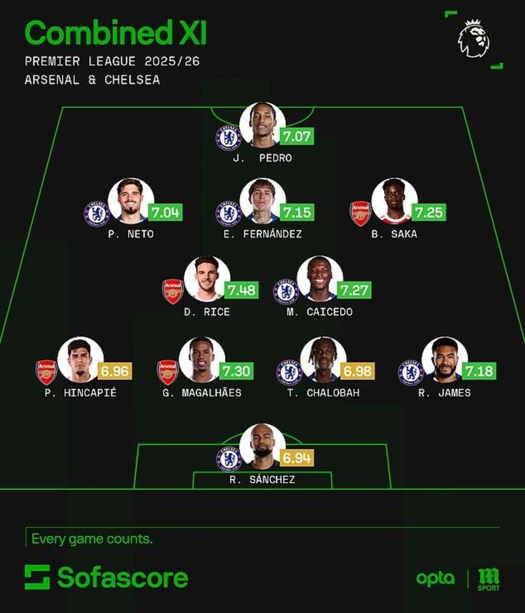 They also have some different selections. While Pedro Neto, Joao Pedro, Robert Sanchez and Moises Caicedo are common across both, in the SofaScore team Trevoh Chalobah has beaten out Wesley Fofana, Reece James has beaten out Jurrien Timber and Enzo Fernandez has beaten out Martin Zubimendi. Meanwhile Marc Cucurella is included for WhoScored, but Piero Hincapie has his place for SofaScore.